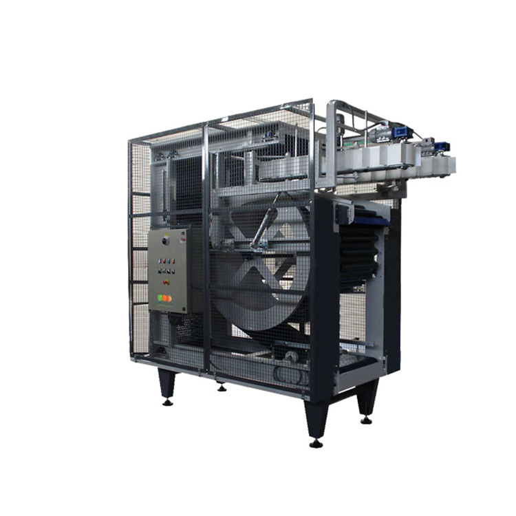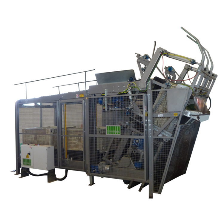 A máquina é adequada para conter: 3 ou 4 caixas empilhadas na seção de alimentação 3 ou 4 caixas na seção de empilhamento 2 caixas na seção de despejo, uma das quais está constantemente na fase de descarga 3 ou 4 caixas na seção de reabastecimento 3 ou 4 caixas empilhadas no transportador de armazenamento.