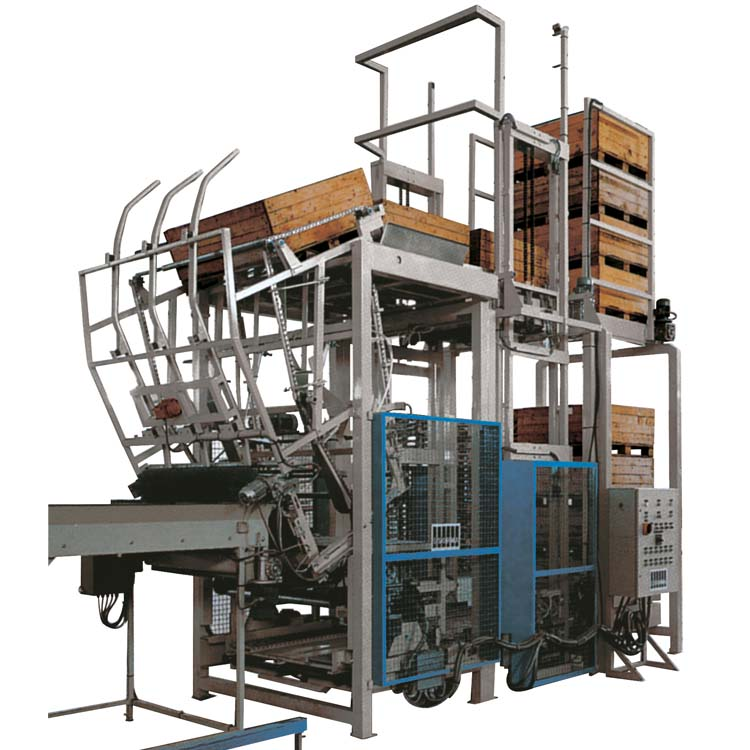 A máquina é adequada para conter: 2 caixas empilhadas na seção de alimentação, 2 caixas na seção de empilhamento 2 caixas na seção de despejo, uma das quais está constantemente na fase de descarga 3 ou 4 caixas na seção de reabastecimento 3 ou 4 caixas empilhadas no transportador de armazenamento.